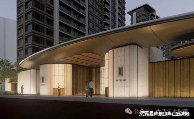 蓝灰色玻璃+仿石铝板+艺术涂料材质,穿插优雅线条,让建筑这张“脸”看起来更高级。One&Only酒店式门头。用雕塑体块、温润弧面和雅致线条,营造具有艺术格调的归家仪式感。