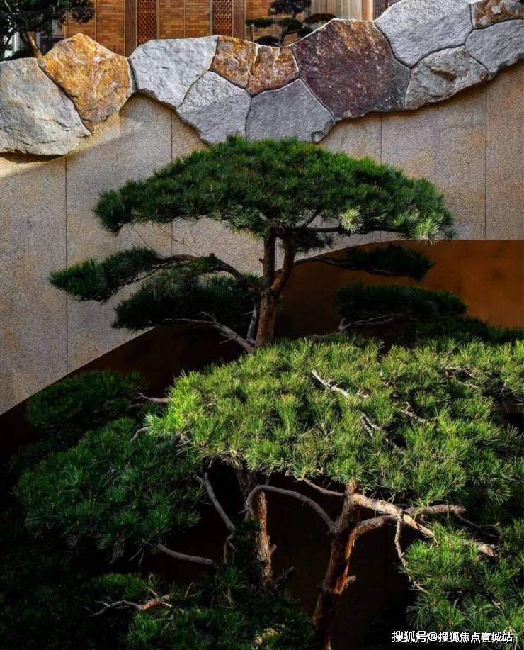 顺着旋梯而下,地下一层高约8米的双杆孪生连理松,与墙面上的原生山石皮,在你身旁环绕成了层峦叠嶂的意象。