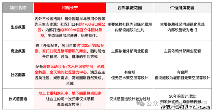 和樾长宁的迭代首先是公区发力,我们可以对比下同板块3个关注度较高小区:和樾长宁、西郊紫薇花园、仁恒河滨花园(最新挂牌价也有12万+)的公区配置。