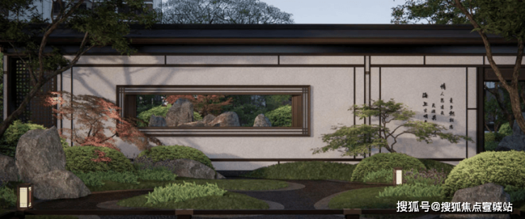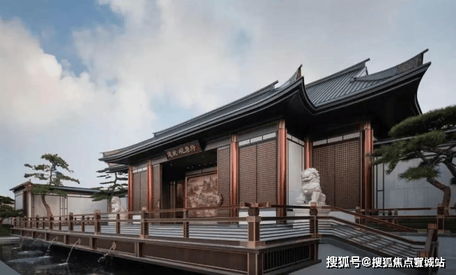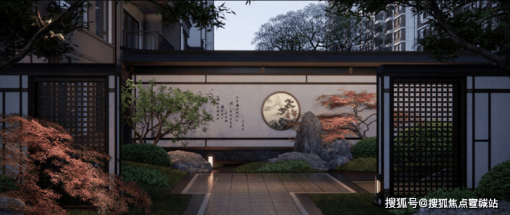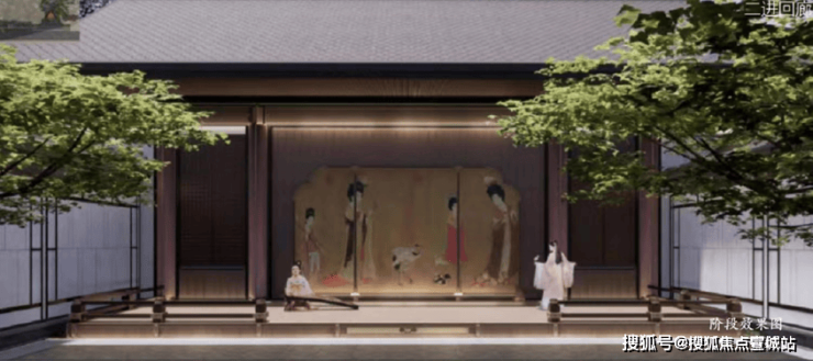 项目采用三段式入户: 一进辋川入画(主入口空间),二进:闲庭碎影(戏台庭院),三进:临风听湖(自然庭院)。入户大门屋顶采用唐代“重檐歇山顶”形式配上台基上的唐代建筑标志阑干,入院后有一副唐风画作,其次以亭台楼榭、理水叠山的中国园林意境,重现盛唐大明宫百花争艳,小桥流水,落叶如金的景观。社区景观层层递进,让住户置身其中,体验唐风山水。