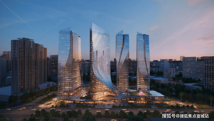 建筑构成:由 4 栋 140 米高的塔楼组成,其中 T1、T2 为珍品公寓,T3 为安达仕酒店,T4 为办公楼,底部是由会议中心、酒店宴会厅、商业、艺术中心及社区配套组成的基底。