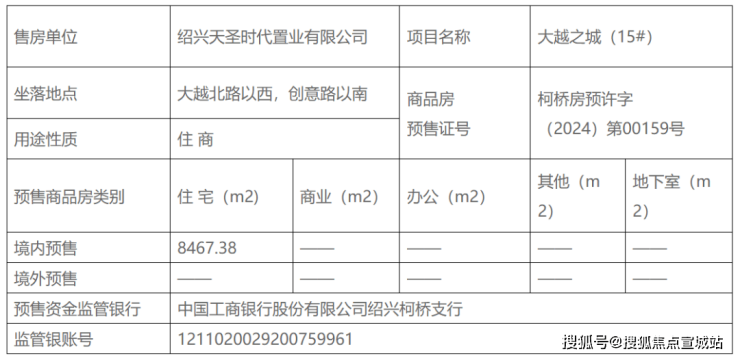 11月20日,柯桥区人民政府网发布了大越之城预售许可公告,商品房预售证号:柯桥房预许字(2024)第00159号。