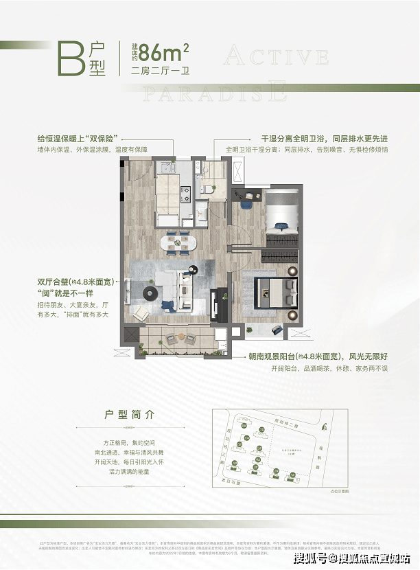 建面约86平两房两厅一卫,做到了双开间朝南+卫生间干湿分离+约4.8米大面宽客餐厅,是舒适型2房户型。