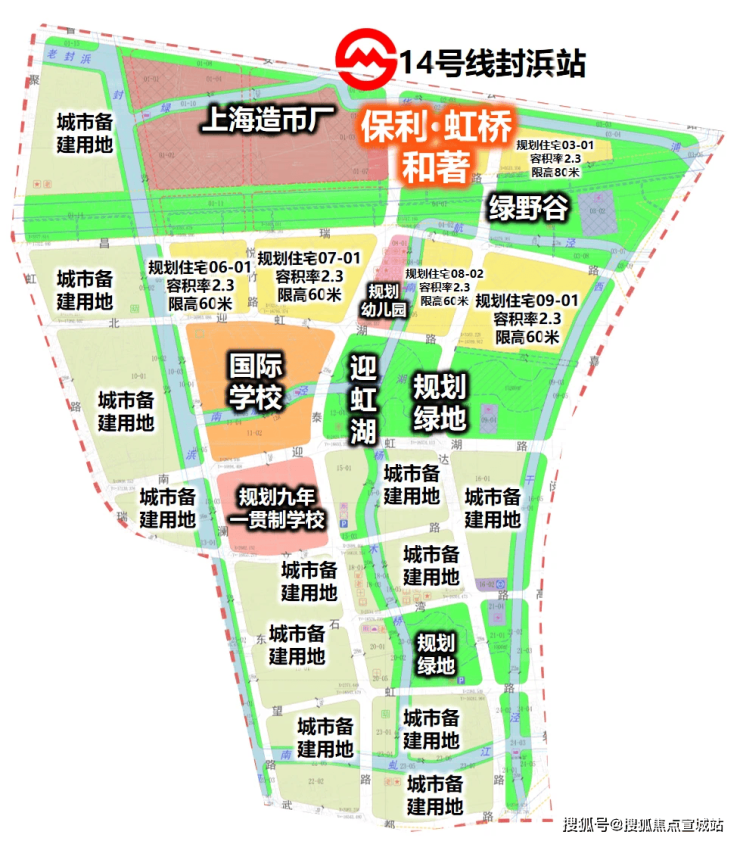 轨交:地块与地铁14号线终点站封浜站的直线距离不到500米,坐一站到乐秀路,未来可以换乘嘉闵线(在建),连接大虹桥、七宝、春申等板块。