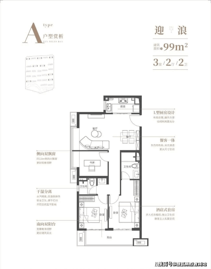 【高层99平】约6.1m大面宽双阳台,近6m客厅观海飘窗,奢享270º三面海景,主卧套房设计,N+1灵动空间!