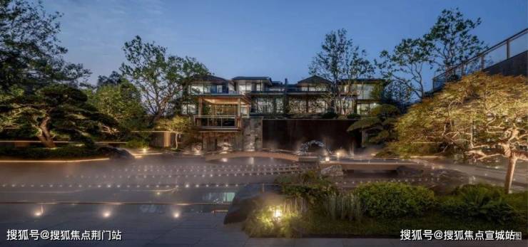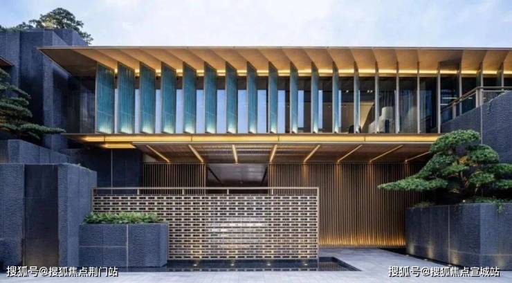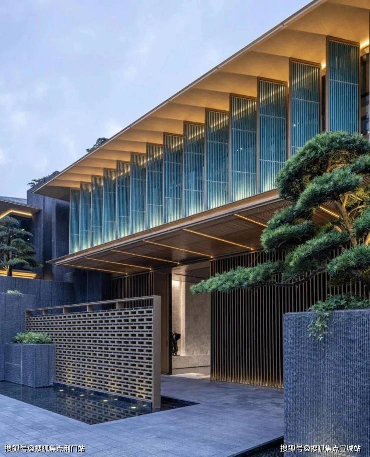 在立面打造上,提取“宋画”中的线条感,提取歇山顶样式,转译形成深远的挑檐,在视觉效果上给人以棱角分明、结构清晰之感,整体呈现一种清雅内敛的当代气质,大尺度巨幕玻璃窗镶嵌金色铝线条,如画框一般,攫住窗外的每一寸风景,让建筑隐于自然