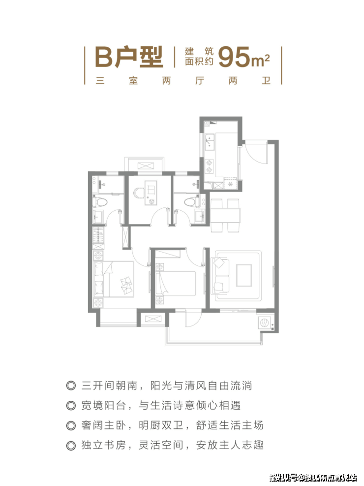 建面约95㎡的3房2厅2卫户型,这个户型的实用性太高了。能保证业主从二人世界到二胎家庭的全生命周期需求。