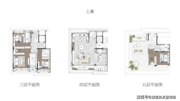 ※动静分区。上叠将起居层设计在三层和五层。这样既不会对下叠造成影响,也更保证了5F主卧套房的绝对独立。四层则作为会客厅,约16㎡露台通过移门延展视觉效果。