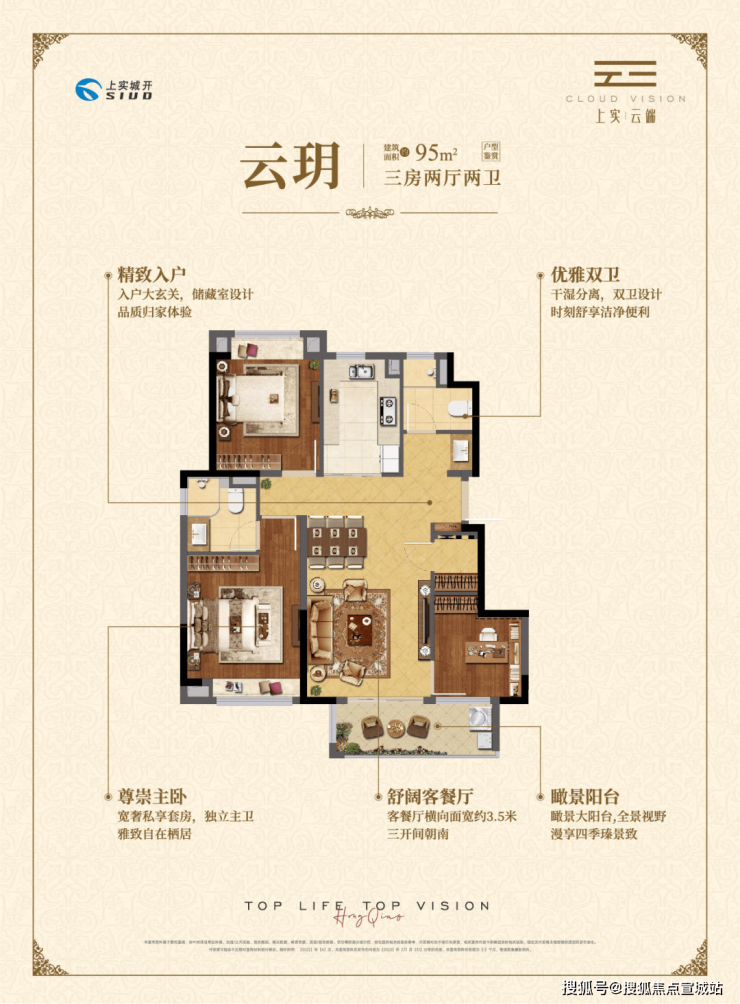 户型:上实云端开发商售楼处电话最新发布:400-8778_334目前只剩 95㎡的三房两厅两卫户型在售。该户型三开间朝南,有瞰景大阳台、主卧套房设计,做到了南北通透,卫生间干湿分离。入户玄关设有收纳空间,客餐厅相连,面宽约 3.5 米,加上瞰景阳台,室内采光、通风良好。