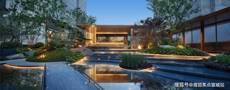 中岛水景,池底采用蓝钻花岗岩和阿尔卑斯灰仿石砖拼花定制星语言铺地,包括两边景墙立面选用高端的爱马仕灰奢石,彰显出顶级石材的大气典雅。包括景墙转角的弧面,工艺难度非常大。