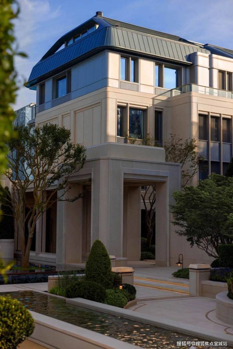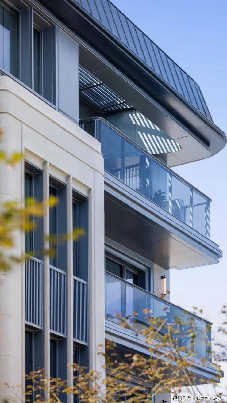 湖山丽舍的古典韵味,还来自三扇长窗的虚实韵律,来自它们层层内退的立体窗框。他们还让古典更轻盈,用铝板来塑造阳台包边的多重褶皱。每一个檐角与窗台,都做成了温柔的弧形转角。建筑的南北立面同样考究,你可以在北立面上也看到这样很讲究韵律感的线条,看到点睛之笔的景泰蓝石材。