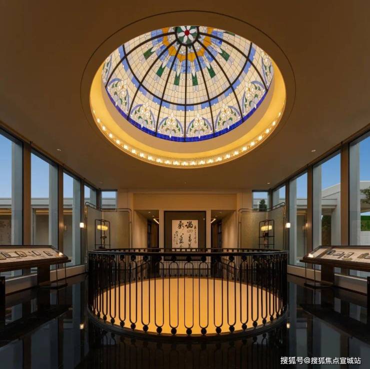 当你从这条街上走过,这座楼盘大门会告诉你,这个气场盛大的环形落客区,会让每一辆进入地库的车,都散发着回家的光晕。环形落客区两侧的大面景墙,浓墨重彩地通铺着价值约600万的景泰蓝石材,它与大门里璀璨的金色扇形穹顶形成了默契的呼应。