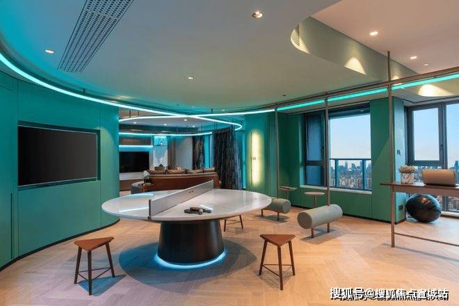 还有吧台、休闲洽谈区、共享会议和健身等功能区,是一个适合交友、会客、休憩、工作、读书、赏景的多功能空间.处处可见的时尚元素,符合当下年轻一代喜好。