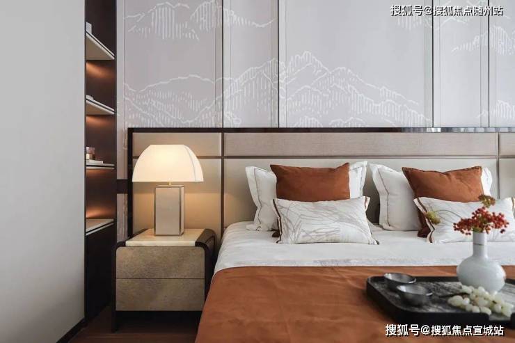 主卧室延续了客餐厅的雅奢韵味,床背景采用细腻的艺术壁纸,展现出一幅中式山景。软装上,将东方特有的符号融入家具、灯具等的细节,床则采用了宽靠背具有中式线条感的特别设计,大气又兼具东方特色。艺术品的陈设上也与客餐厅遥相呼应,运用山景的静谧,营造出卧室的悠然自得。