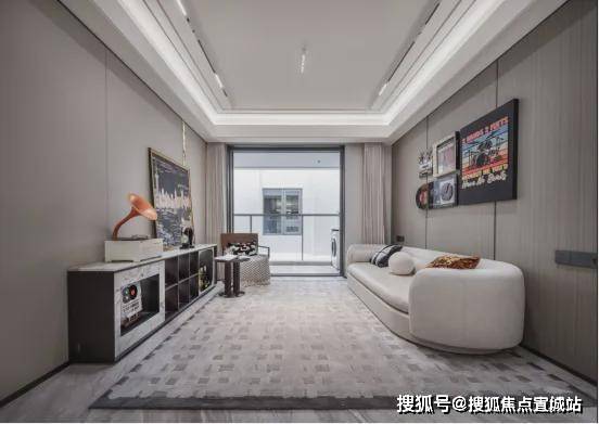 客厅:健康系统,极致工艺(圆弧形吊顶搭配无主灯设计、定制地砖减少拼缝)