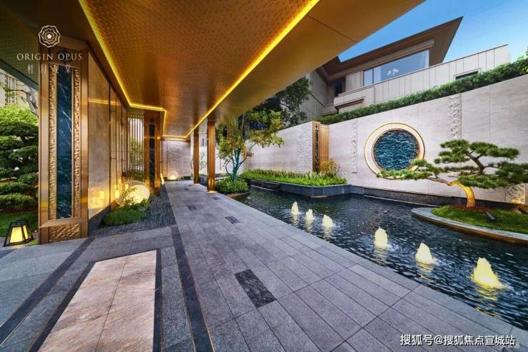 月影江南灵韵入境:入户两侧水景清泉涌动,婉转迂回,一座精致的宋风美学馆展示在眼前。透过门框衬映出满月景墙,甄选名贵奢石,在虚实掩映间延续着东方诗意山水的写意画卷。