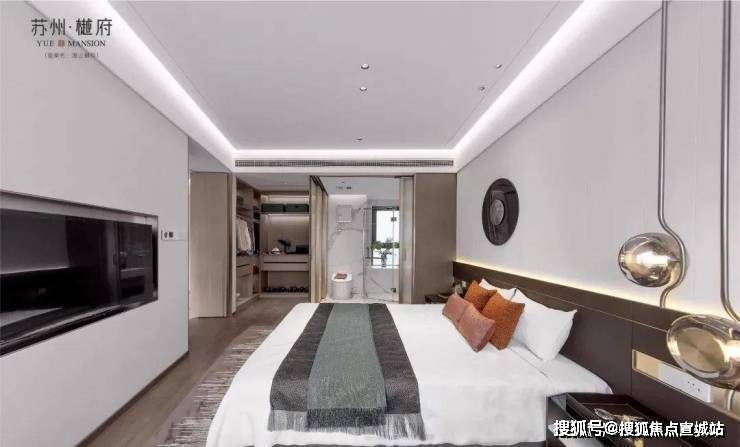 吴中木渎苏州樾府户型设计独特超高得房率约83%-86%,大面宽朝南开间,南北通透,卧室采光面无空调外机位设计,全景飘窗环伺。