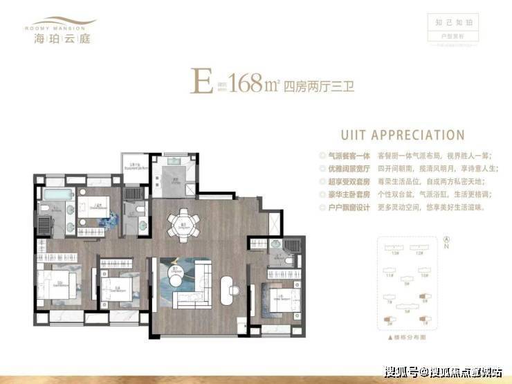 主力户型:142-188㎡四居室,四开间朝南、南北双阳台,部分为横厅 + 三卫设计,得房率 80%-85%。