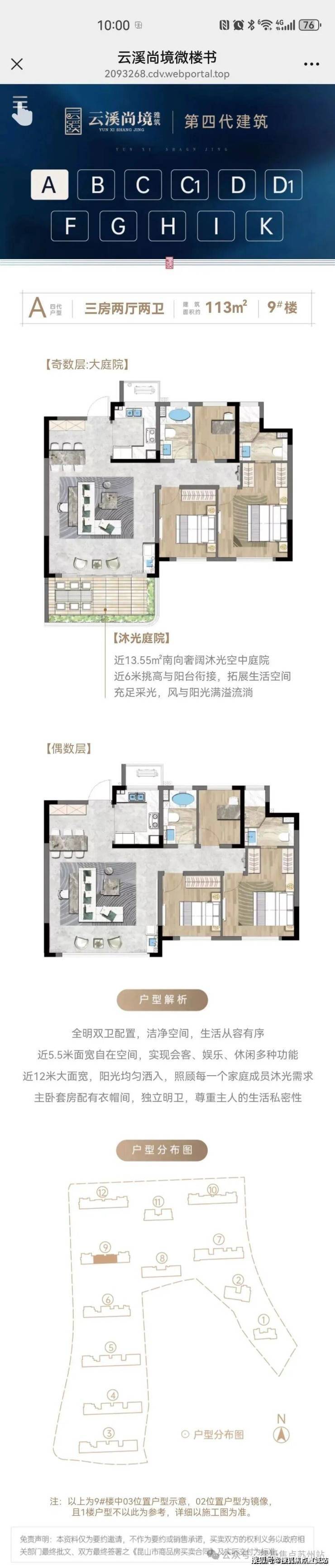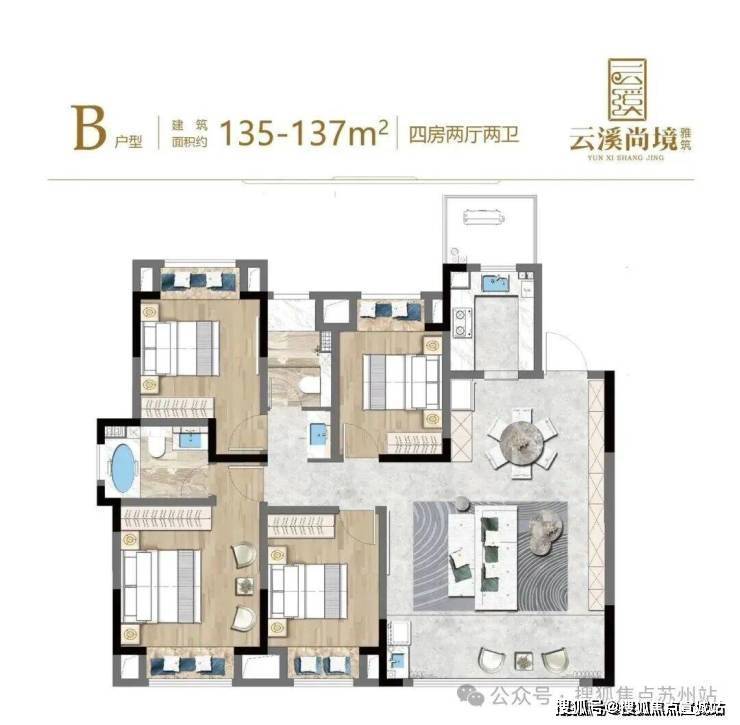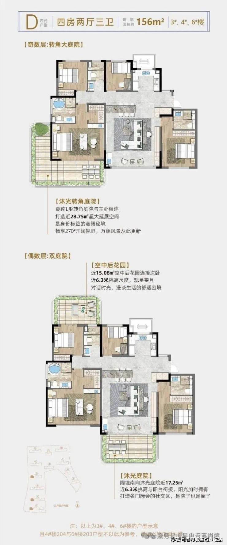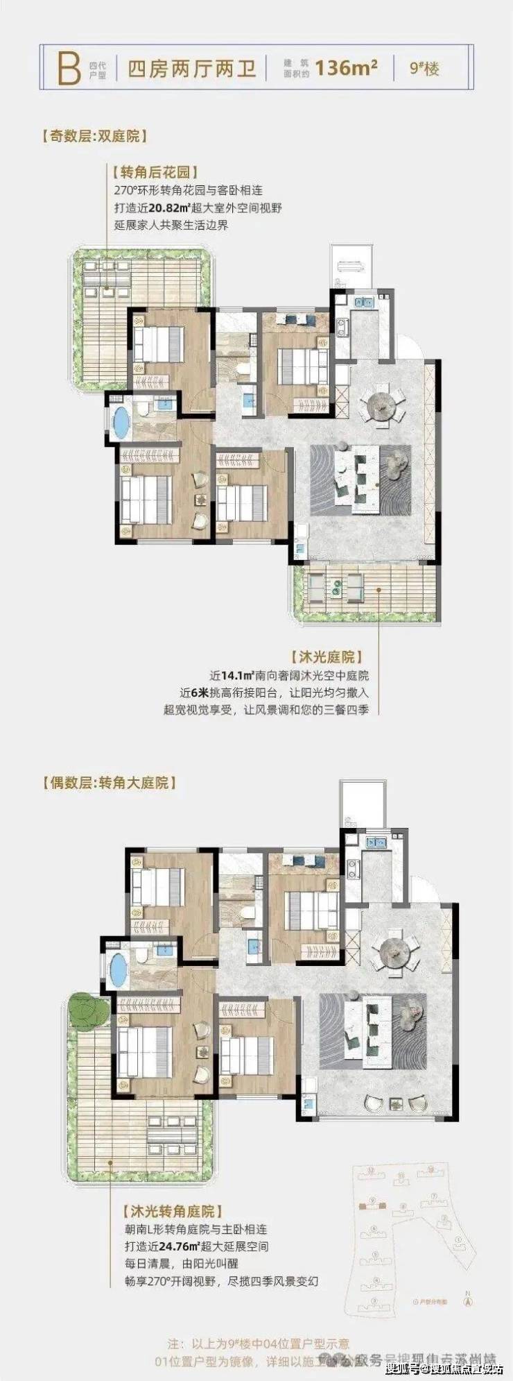户型亮点:全明设计,部分户型面宽达 20 米,带 12 米横厅;四代住宅户户赠约 13-45㎡庭院,部分配 L 型 270° 转角庭院、6 米挑高露台,主卧为独立套房设计。