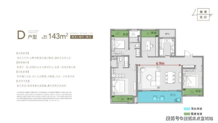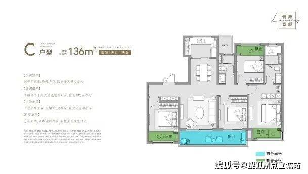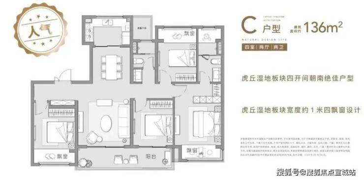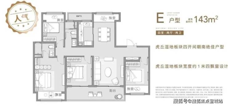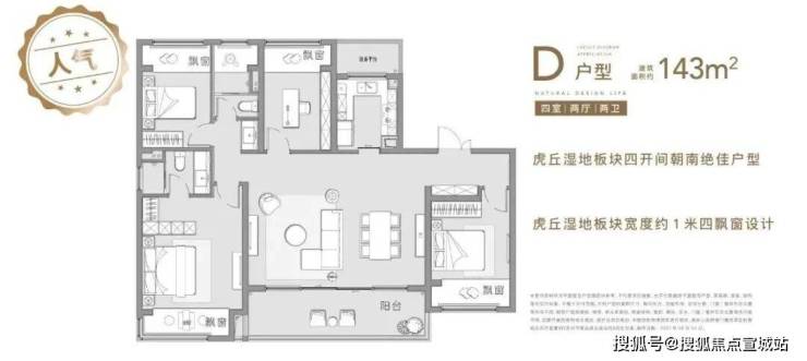 136㎡和143㎡户型均是四房四开间朝南,大横厅或者双联阳台可选,属于市场上主流的改善产品。值得一提的是,项目赠送的约一米进深大飘窗据说是板块内最宽飘窗。