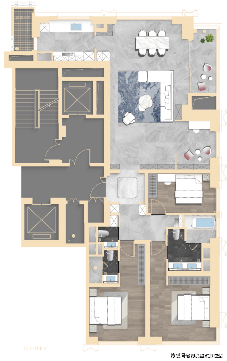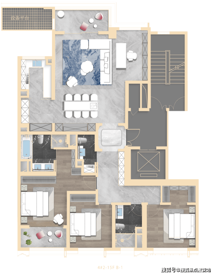 1号地块:建面约197-600㎡,为高层3-5房户型。其中建面约193、237㎡为类一梯一户设计,建面约303㎡标配2梯1户。