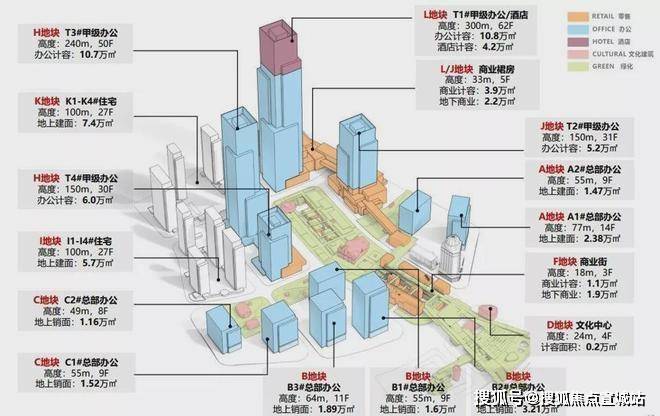 T1-300米超高层塔楼上部46-62层为五星级酒店(丽思卡尔顿)、38,40-45层行政公馆,中部7-37层为甲级办公,底部为商业及大堂。