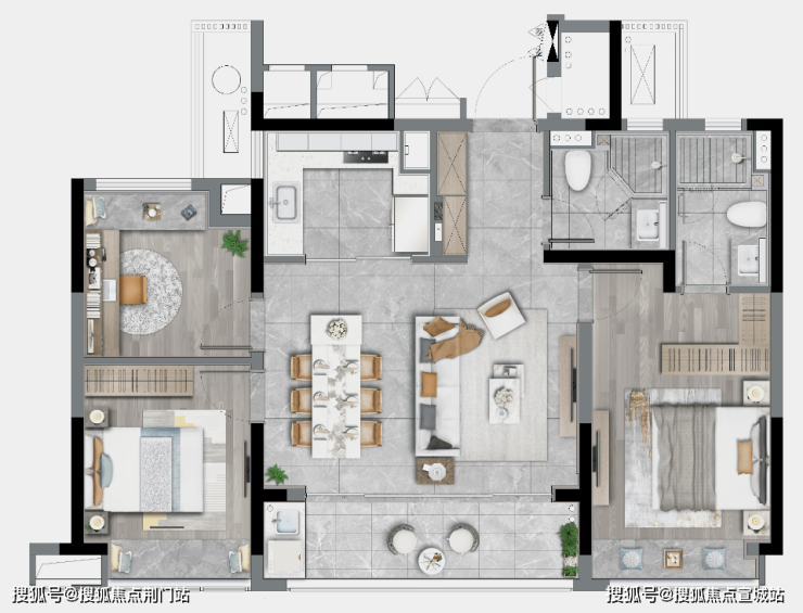 125㎡四房两卫同样是边套:三个卧室均排列在南侧,充分实现了“阳光平权”,每个家庭都可以沐浴在阳光中醒来.LDBK一体化的公区,充分实现了家庭成员间的互动;除了边厅外接的阳台外,南向次卧同样设计了阳台,兼顾了景观和晾晒的需求.
