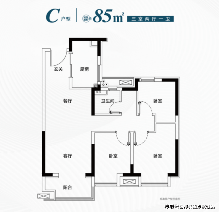 建筑面积约85㎡三房:三开间朝南,餐客厨一体化,特别适合年轻的三口之家。