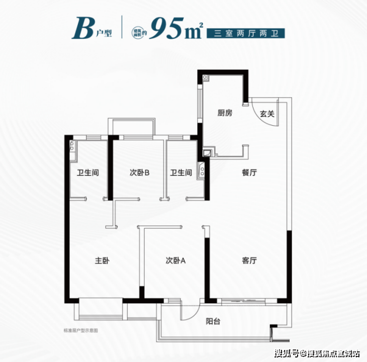 建筑面积约95㎡三房:双卫+南北通主卧,南向面宽近10米,预留岛台改造空间,可做到“二胎不换房”。