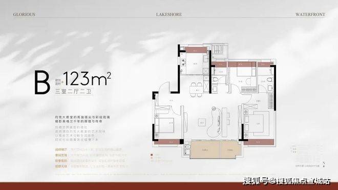 户型特点:123㎡小高层采用横厅设计、270°转角飘窗,装标约3000元/㎡,配备大金中央空调及地暖
