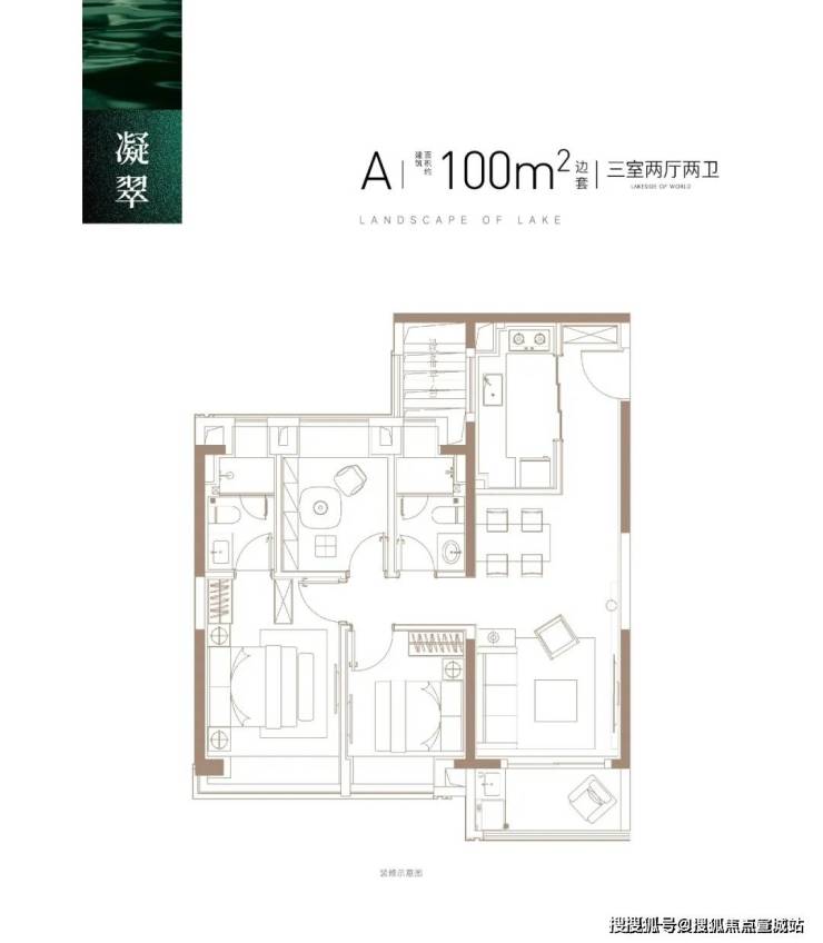 100㎡三房两厅两卫:三开间朝南,主卧套房设计,动静分离,全卧室带飘窗。