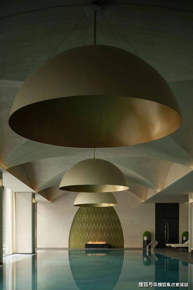 泳池在几何关系中得到了构建,层层叠叠的拱形吊顶拼接,对侧的落地窗映射室外的开阔景观,石质的肌理进行还原表达,分别从视觉与触感上映射自然主义。