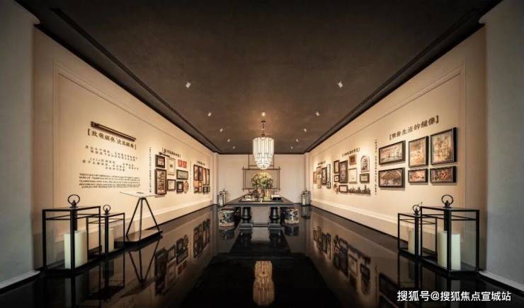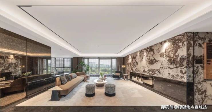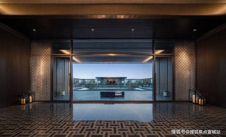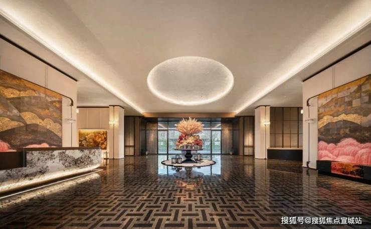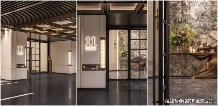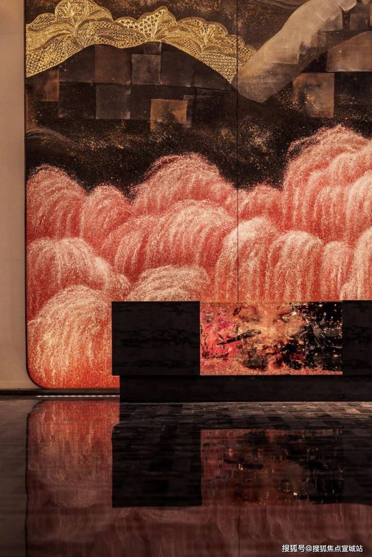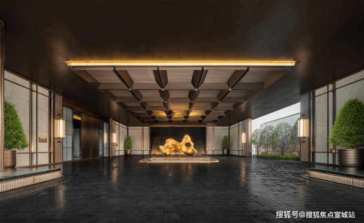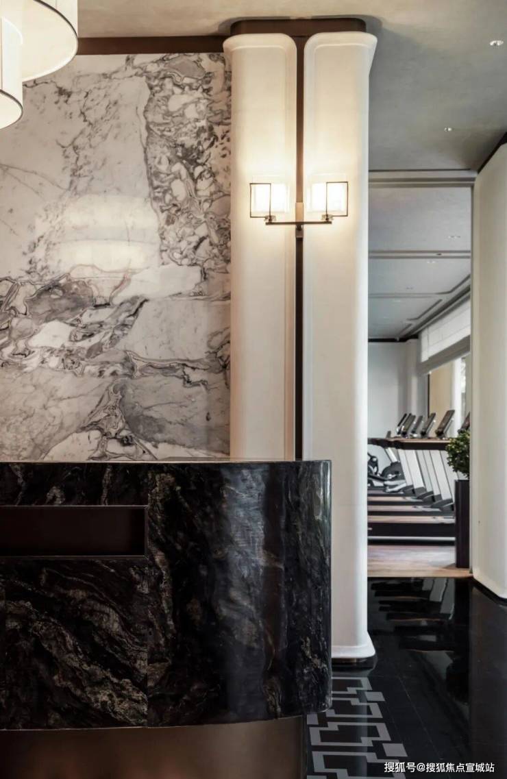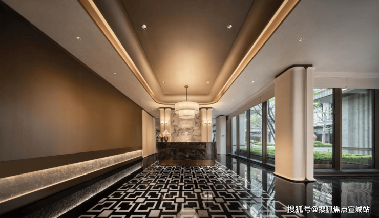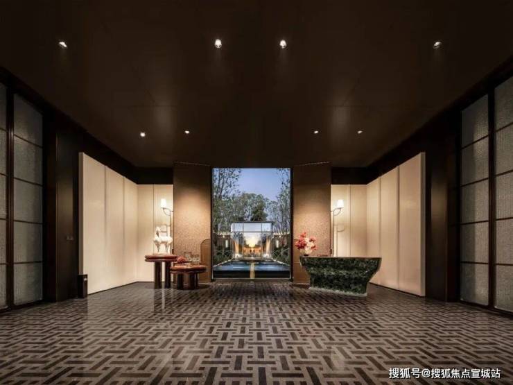 车马院以上海半岛酒店作为灵感来源,在设计方面采用了海鸥丽晶酒店同款的接待门,凸显出尊贵的大家门厅风范;营造社区归家的玄关,下挂式的星空顶、艺术雕塑、迎宾叠水以及范思哲黑背景墙相互映衬。