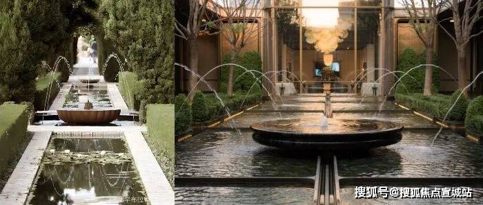 长廊水院致敬了西班牙的艺术瑰宝阿尔汉布拉宫,素有“银河的眼泪”之称的半宝石级蓝翡翠奢石被铺装在了水台,经典的阵列式跳泉有了更灵动的展现,又呼应了轴线感。
