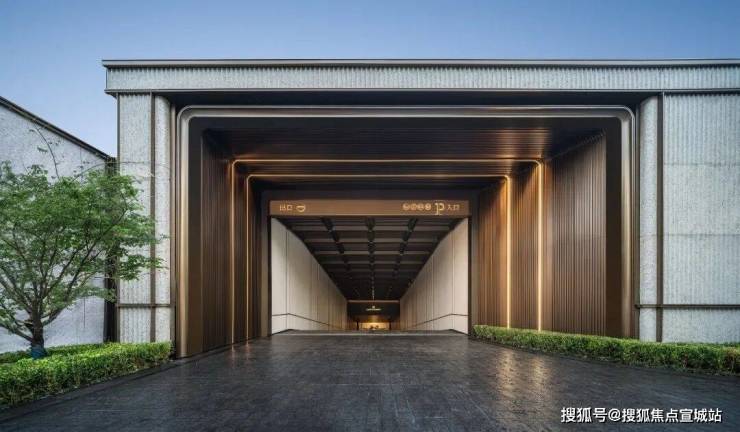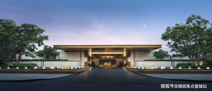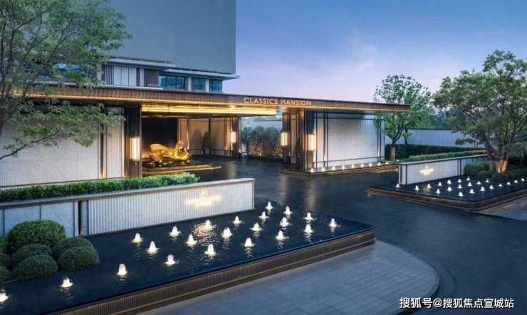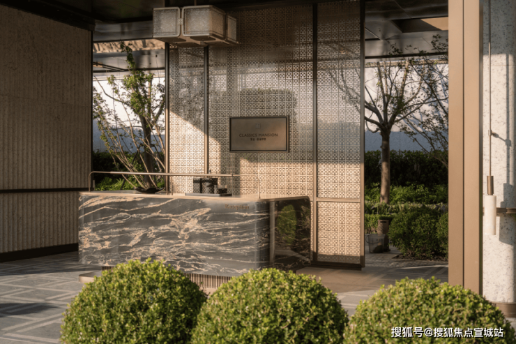 约420㎡的半岛酒店式车马院,含景墙宽约100米、高约6.3米的礼序大门,构成立体的归家空间尽显气派。古铜色铝板重顶、如折叠玉石屏风的三面白世贸波纹石材景墙与福鼎黑晶石地面承托起社区的门面。