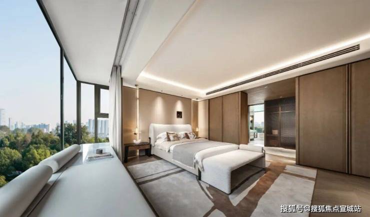 建筑立面设计汲取古典三段式构图精髓,通过横向水平线条的连续性与竖向柱列的支撑,形成建筑的基本韵律和节奏。顶部的开放式飘板设计赋予建筑轻盈的轮廓,单体建筑的比例在群体关系中得到进一步强化,建筑的进退与高度的轻微起伏,带来了群体关系上的灵动感受。面向城市的落地窗和转角飘窗消解了建筑的体量,将景观引入居住内部空间。