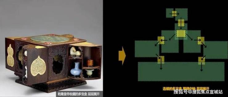 空间设置正如乾隆皇帝收藏的多宝盒一般精妙,层层展开后,有无数的宝藏串联在一起,起承转折的轴线空间中,拥有着无尽的惊喜。