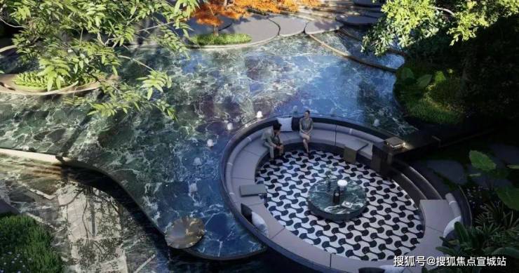 并且将中心场地抬高1米,在水系池底通铺1300多片的PRADA绿石(仿石砖)、精选斜飘乌桕、造型紫薇等名贵树种...