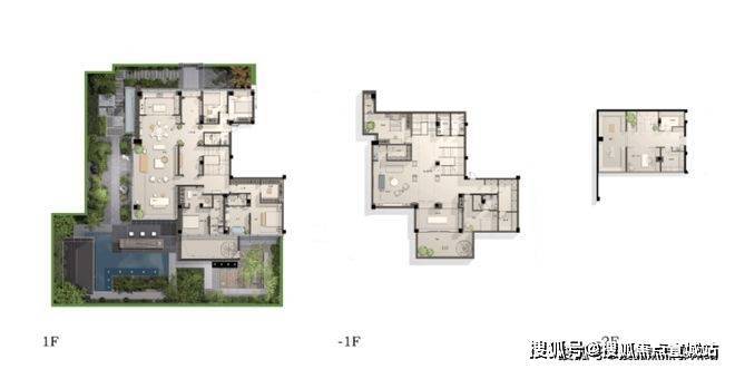 室内共4个户型各有特色,顶楼建筑面积约333㎡和建筑面积约357㎡的户型,约42m的面宽,相当于2/3个足球场的宽度,餐厅上方有天光倾泻而下,约250㎡的露台,像苏州园林般布局,主卧外还有个星空SPA池,躺在温暖的水流中,望着西湖群山听巴赫的《平均律》。