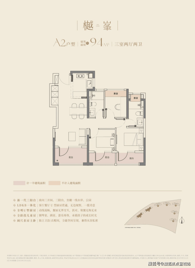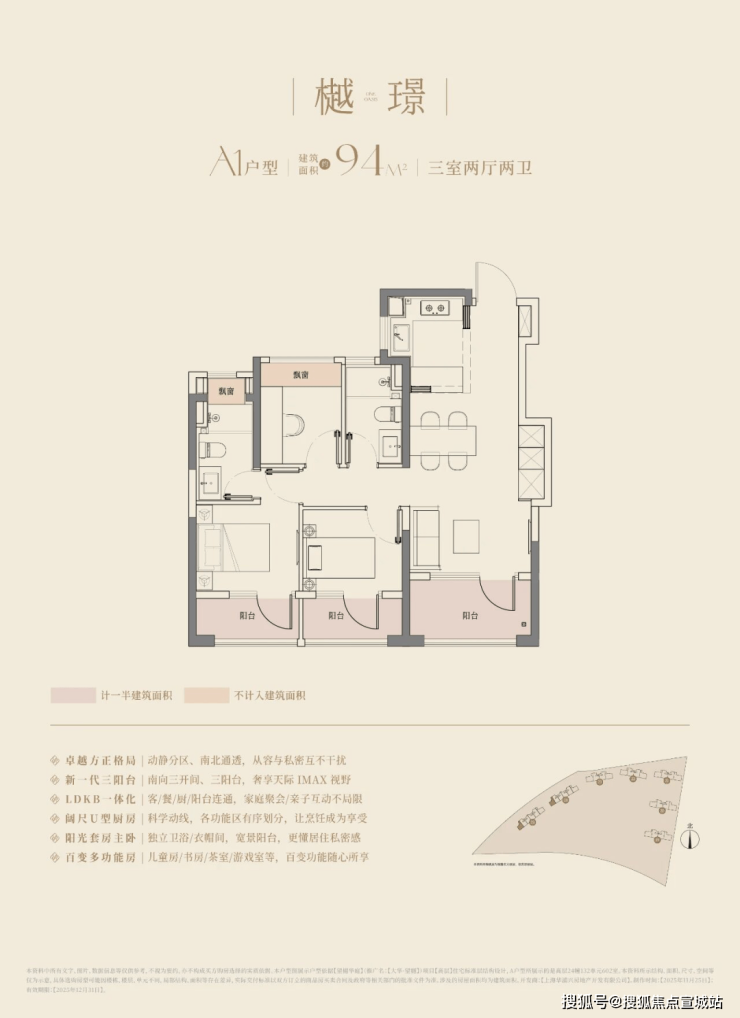 建面约106㎡的三房两厅两卫,3.5开间朝南,南向面宽达到约11.8m!碾压市面上以前的三开间朝南、10米面宽的三房户型。