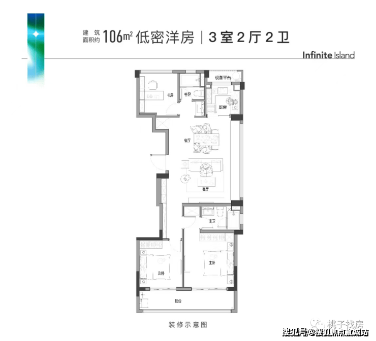 建面约106㎡的户型是市场上难得的小户型边套产品,南向双开间,同样的双联阳台打造,餐客厅一体化设计链接阔景飘窗,充分保证整个房间的采光面,后期居住舒适度更高。