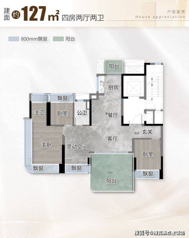 项目作为新规户型代表,实测使用率高达120%,所有户型均为纯板式设计,实现100%南北对流与100%全南向布局。127㎡户型做到四面宽朝南,南向采光面达13.8米,搭配南北双阳台,生活与观景功能分离;客厅采用灵动设计,与次卧打通后可形成7.3米超级方厅,主套为270°弧形转角玻璃全景舱,开间3.5米,配置独立卫浴与豪华衣帽间。