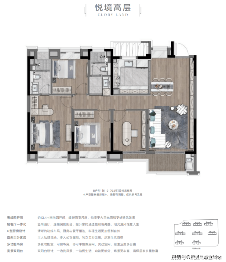 3+1开间朝南+全卧室带飘窗+主卧套房设计+南北通透+动静分离+独立书房,“一步到位”的改善4房户型。