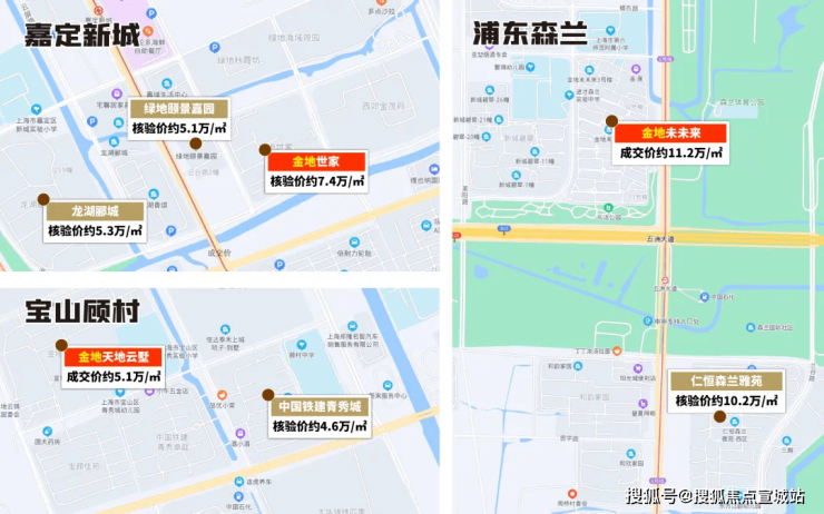 再如浦东森兰的金地未未来、宝山顾村的金地天地云墅,也普遍比其余二手房高出约1万/平!
