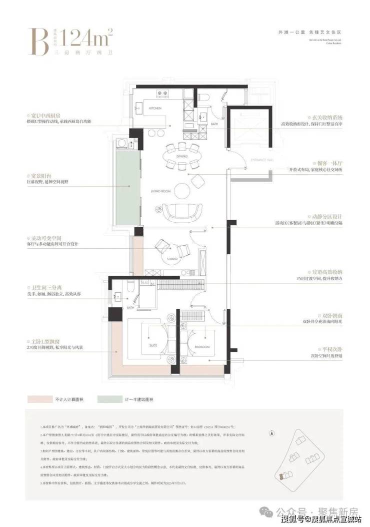 建面约124㎡的边厅“全景舱”户型,是外滩板块极致稀缺的臻品。它以三房布局满足主流家庭需求,更以无遮挡的视野与巨幕般的边厅落地窗,将城市天际线化为私藏画卷。主卧270°L型飘窗,让阳光与风景成为生活的主角。