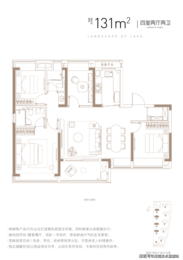 建面约131㎡4房2厅2卫,两梯两户设计,给足了业主归家仪式感和尊崇感,同时拥有一个尺度阔绰的入户门厅作为自己家的延伸!