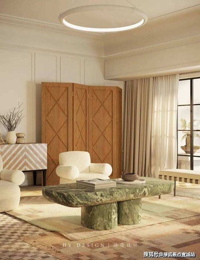 Thematcha-coloredmarblecoffeetableinthespaceislikeagemunearthedfromtheOrientalsecretland,withadeepandmysteriouscolor,formingasharpcontrastwiththesurroundingscenery.Theretrogreenlightingseemstohavecomethroughfromanancientcastle,withanelegantanduniqueshape,emittingacharminglight,envelopingtheentirespaceinamysteriousandromanticatmosphere.