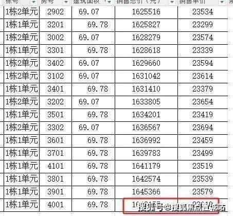 总价最高的是1栋1单元4001房,总价164万,单价23619元每平。