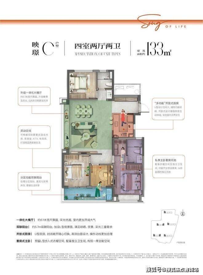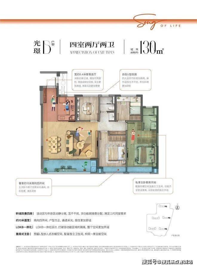 建面约130㎡户型,南向四开间,享约13米阔绰面宽。约6.4米餐客连厅,结合双联阳台,同样创造处丰盛、从容的会客、活动空间。套房主卧空间独立成区,为主人创造更私密的美好生活享受。崇璟和颂府售楼处营销中心:400-8828-814崇璟和颂府售楼处电话/地址☎:400-882-8814(开发商热线)