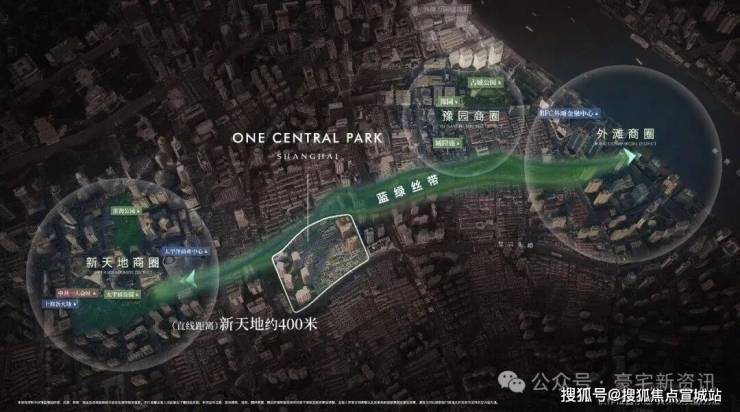 距离新天地直线距离约400米,作为蓝绿丝带规划上的关键节点,随着大新天地东进南拓战略逐步实施,通过水景、绿地和公共空间,串联新天地、豫园、外滩三大世界级商业版图。
